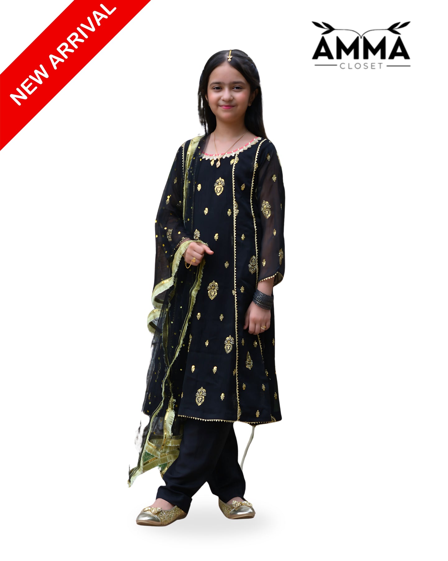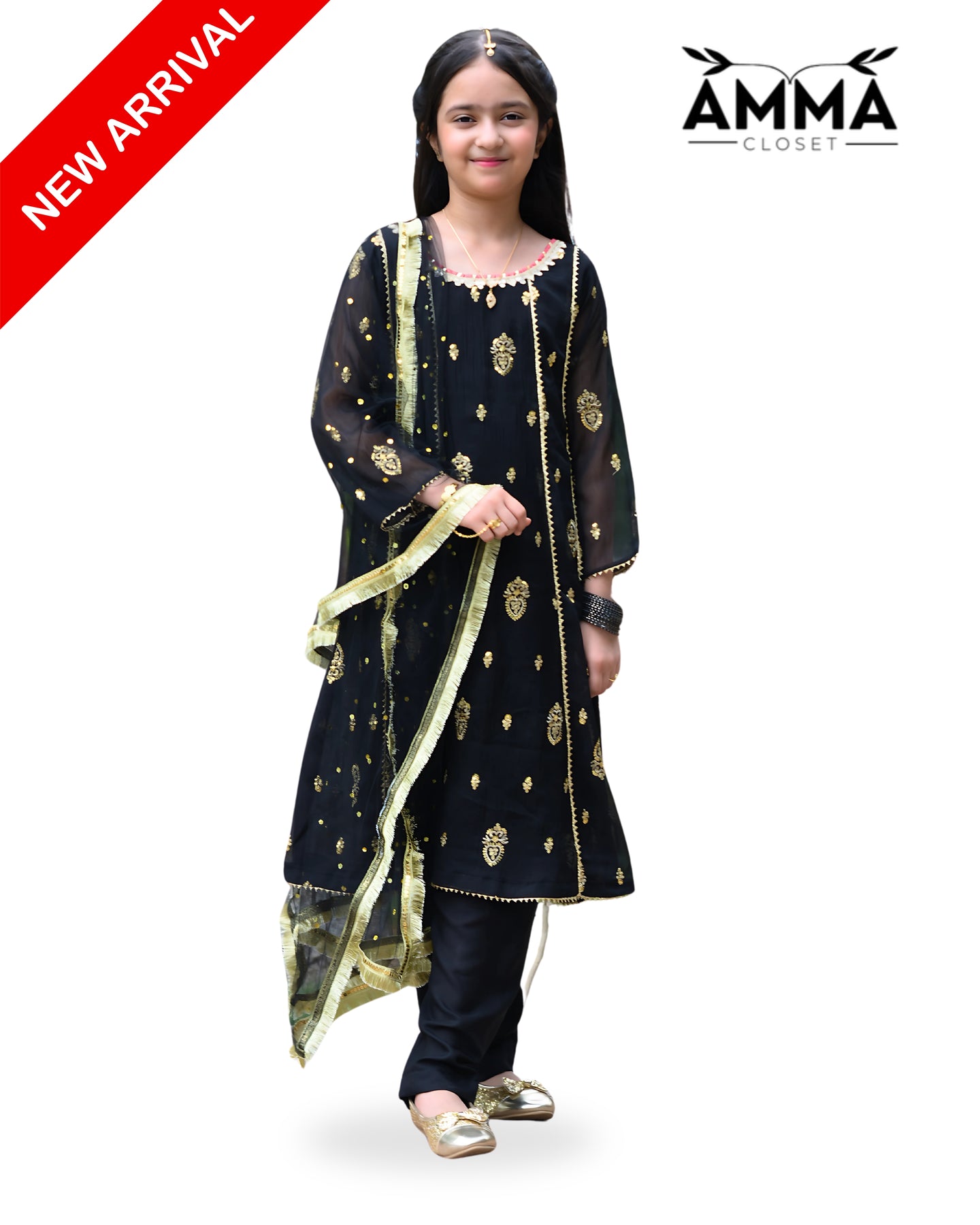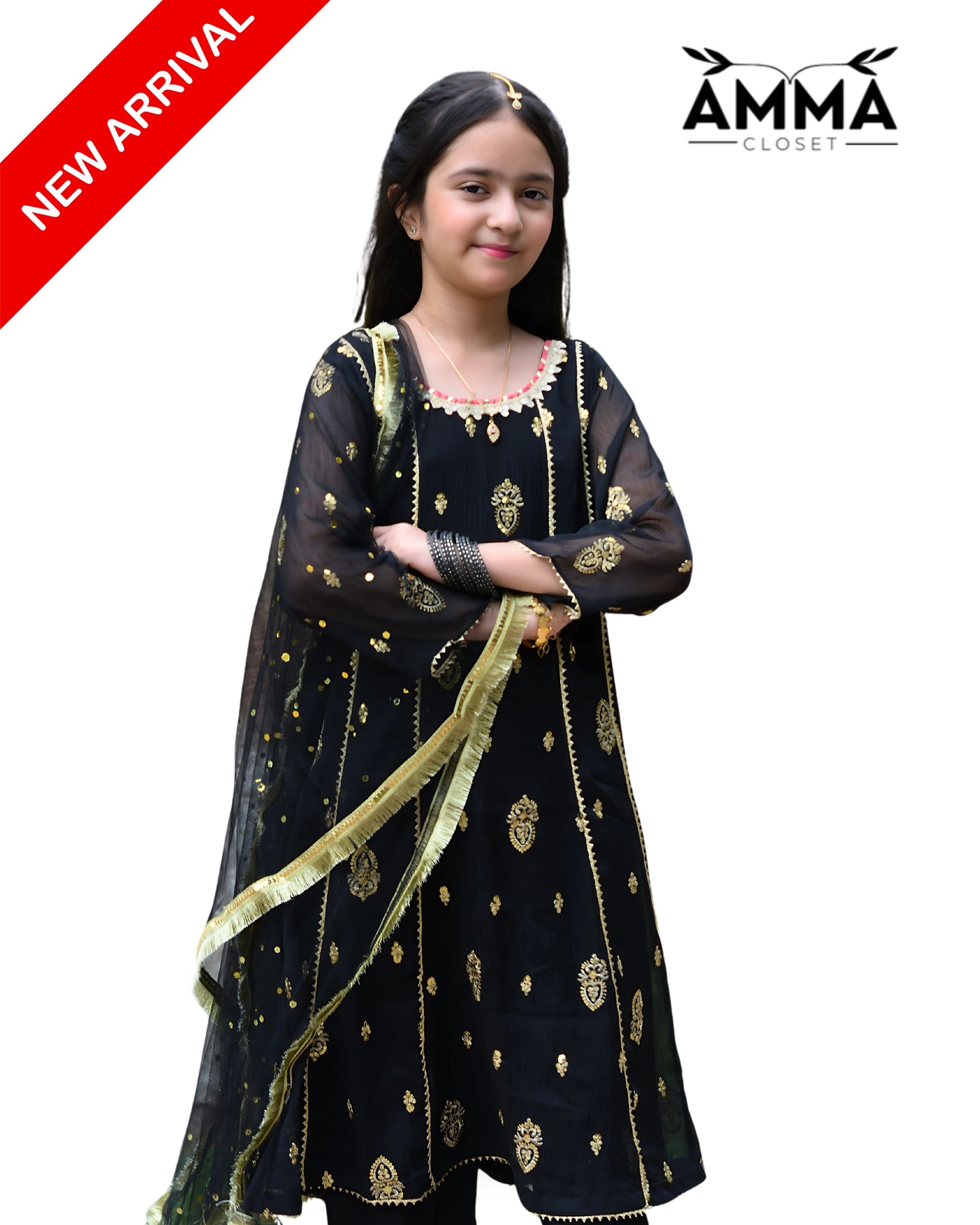 Embrace timeless elegance with this Black A-Line Anarkali Set, designed in chiffon with crepe trousers and a graceful dupatta — a perfect pick for weddings and formal guest wear.