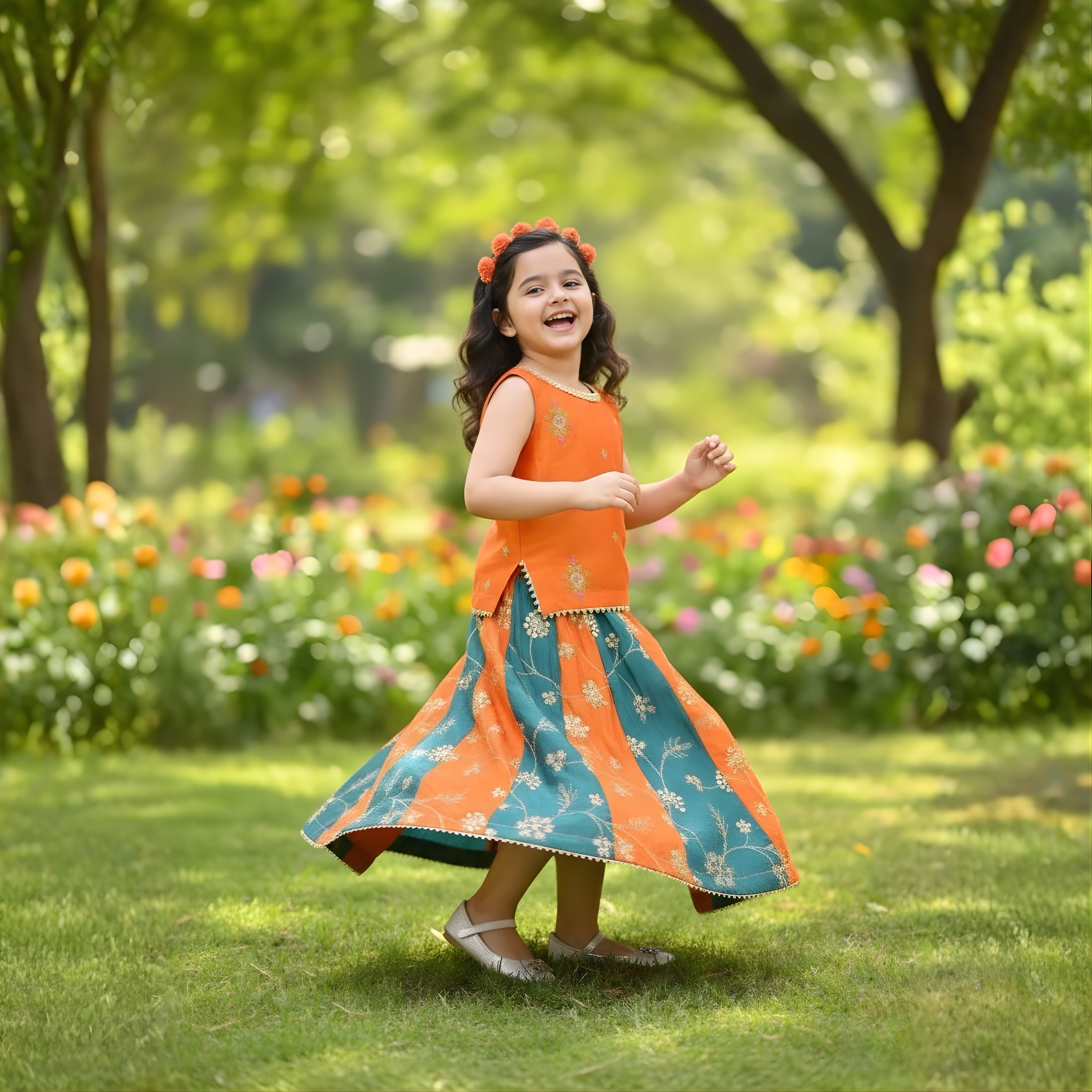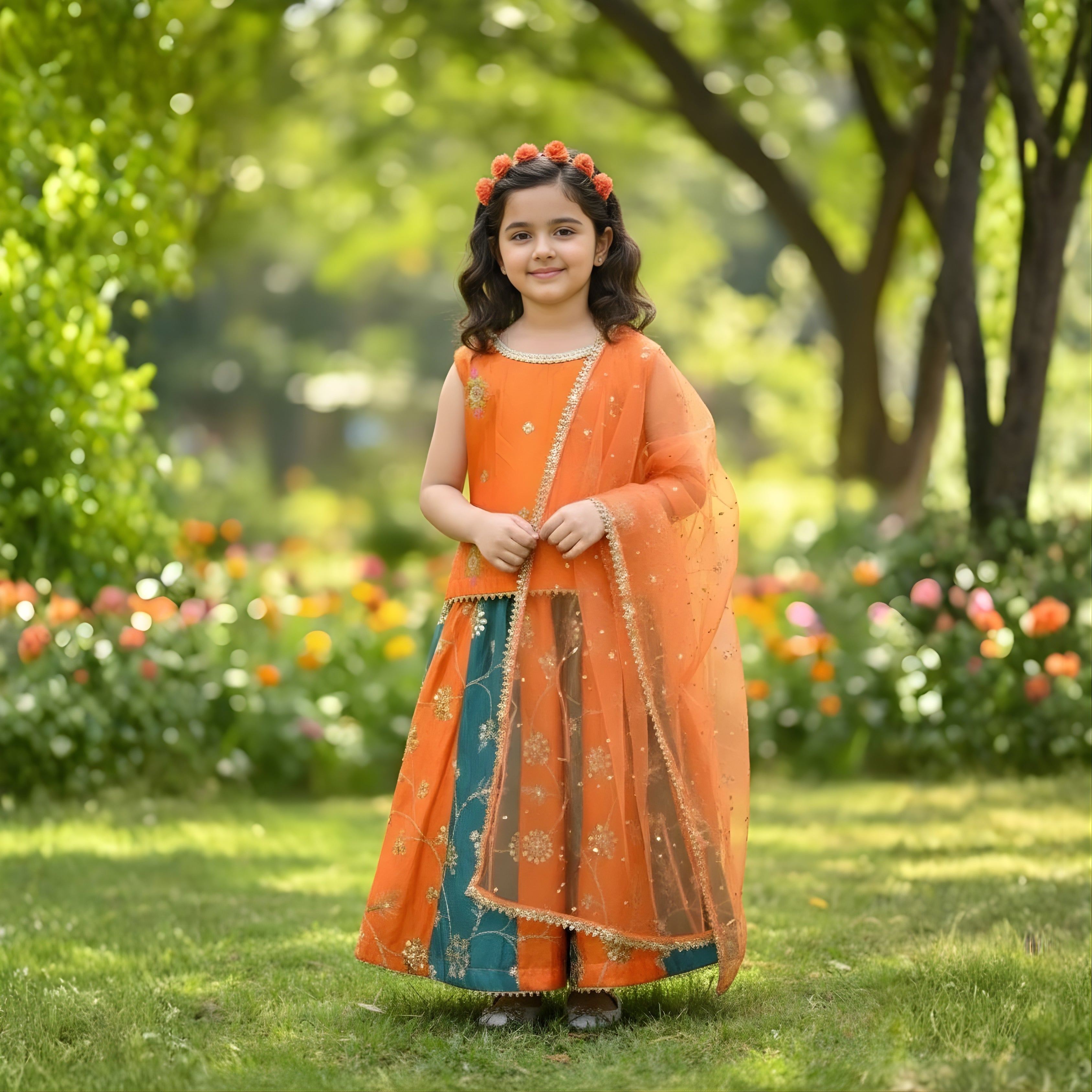Brighten up celebrations with this vibrant 3-piece multi sharara set, beautifully adorned with golden embroidery and contrast detailing — perfect for festive occasions and special moments.