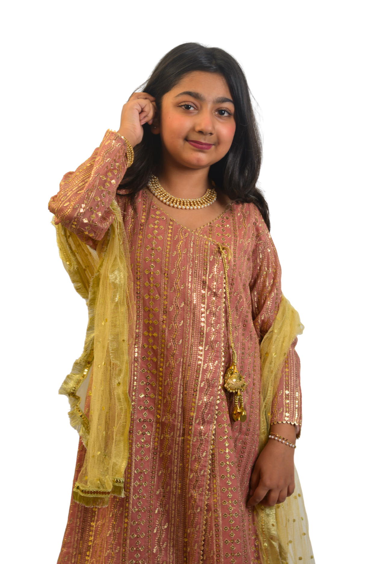 Turn heads this season with our Coral Pink Angrakha Set, crafted in chiffon with elegant detailing, paired with straight bottoms and a dotted net dupatta finished with Kiran lace — a flawless pick for festive and party wear.