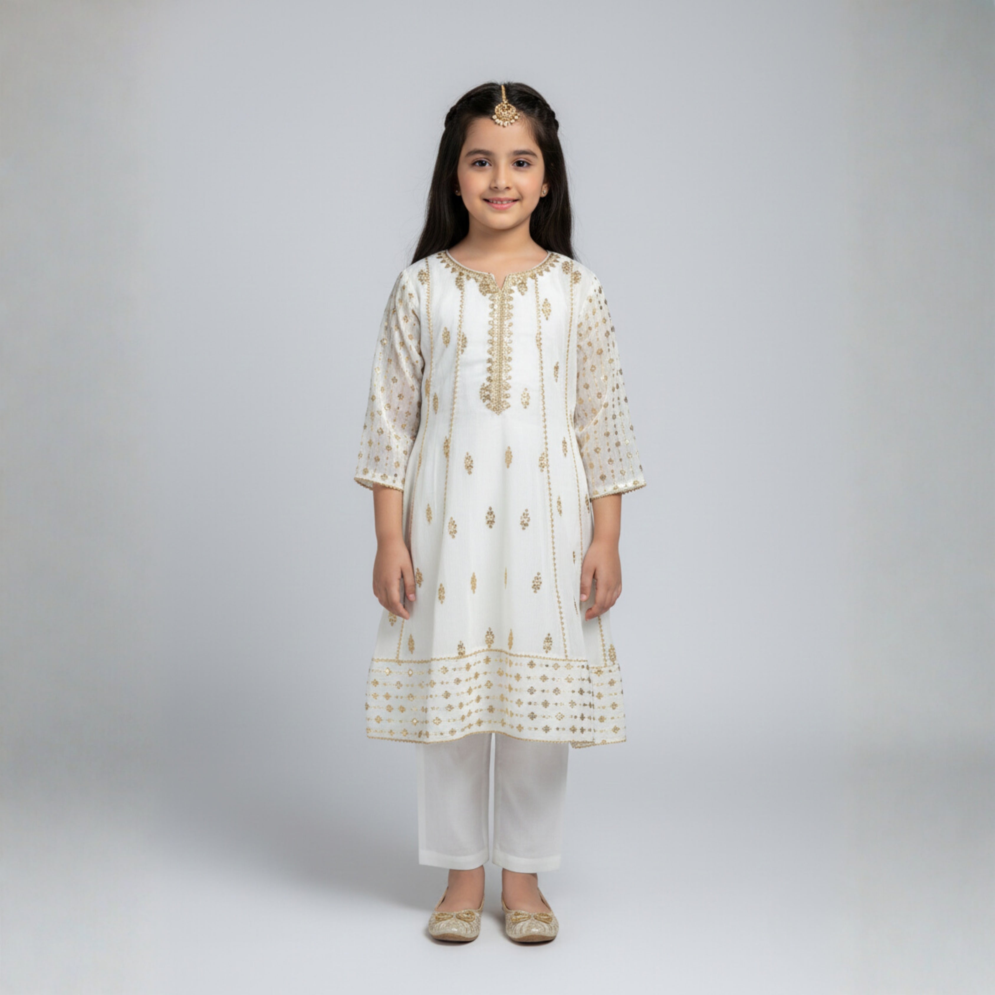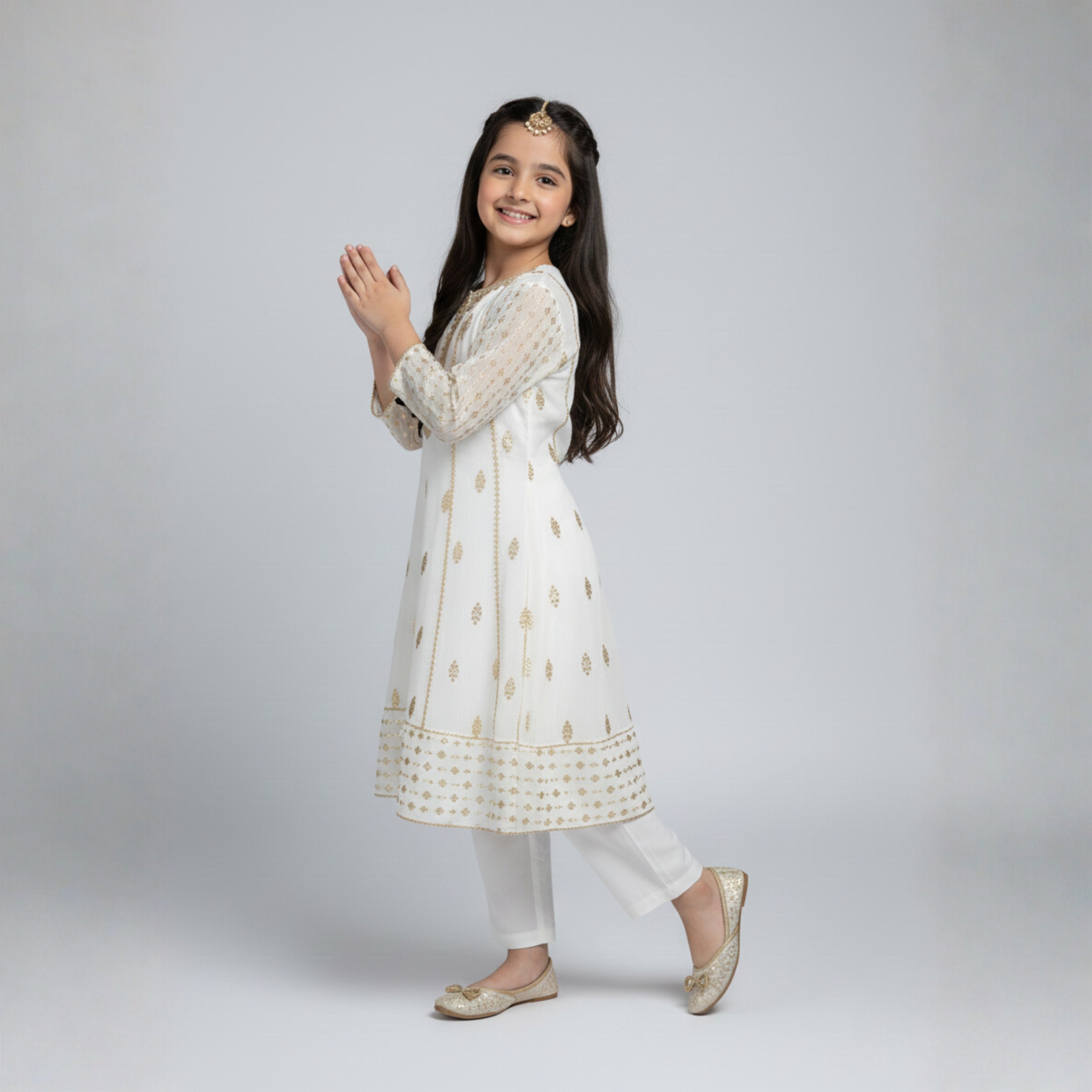 Grace your festive moments with this elegant Pishwas Set, featuring chiffon pishwas, crepe trousers, and a dotted net dupatta with Kiran lace — a perfect blend of tradition and style.